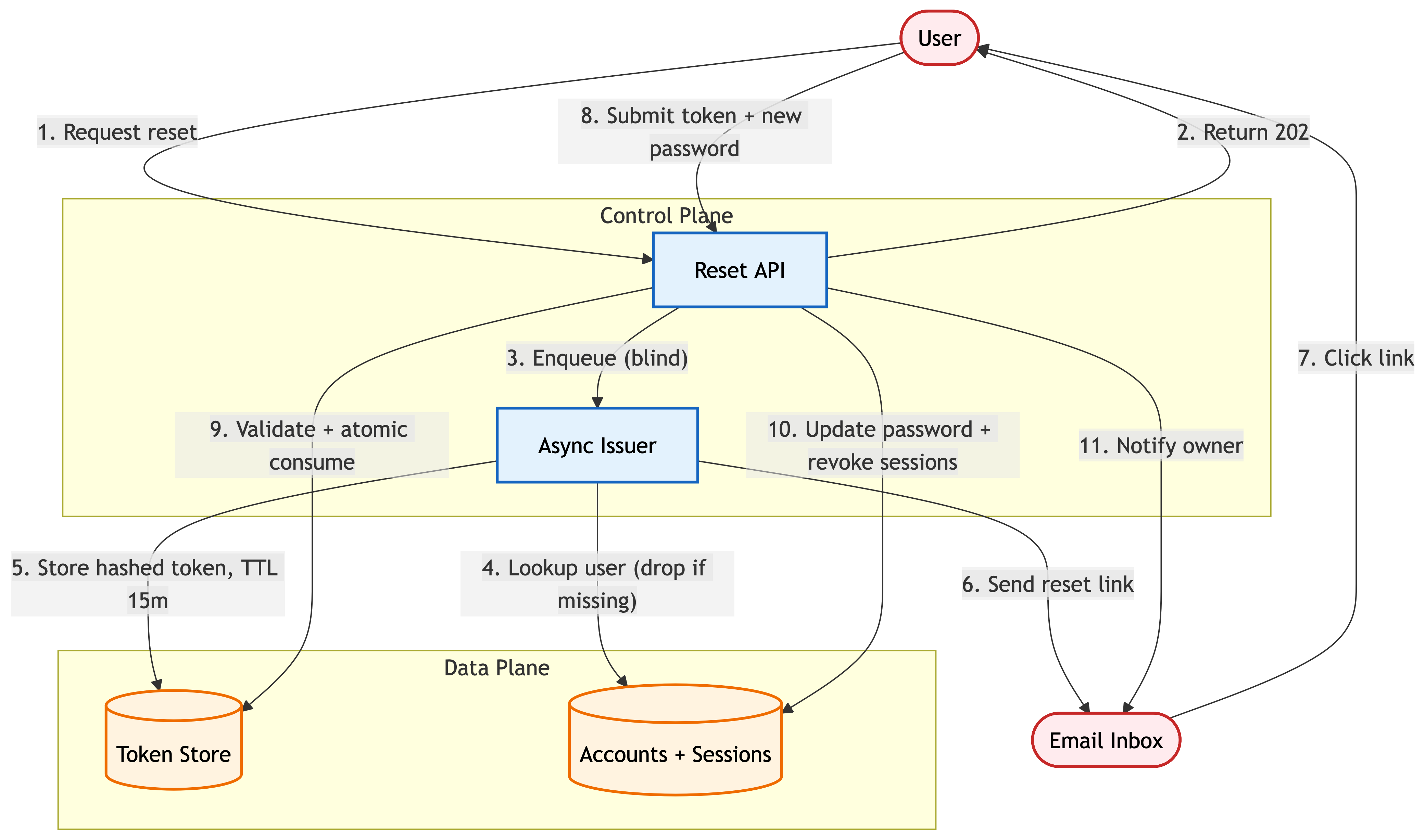 Client requests reset by email → API enqueues the request → Worker issues a token and emails the reset link → Client posts token with new password → API validates and atomically consumes → API updates password and revokes sessions → API notifies ownerRelated patterns:
